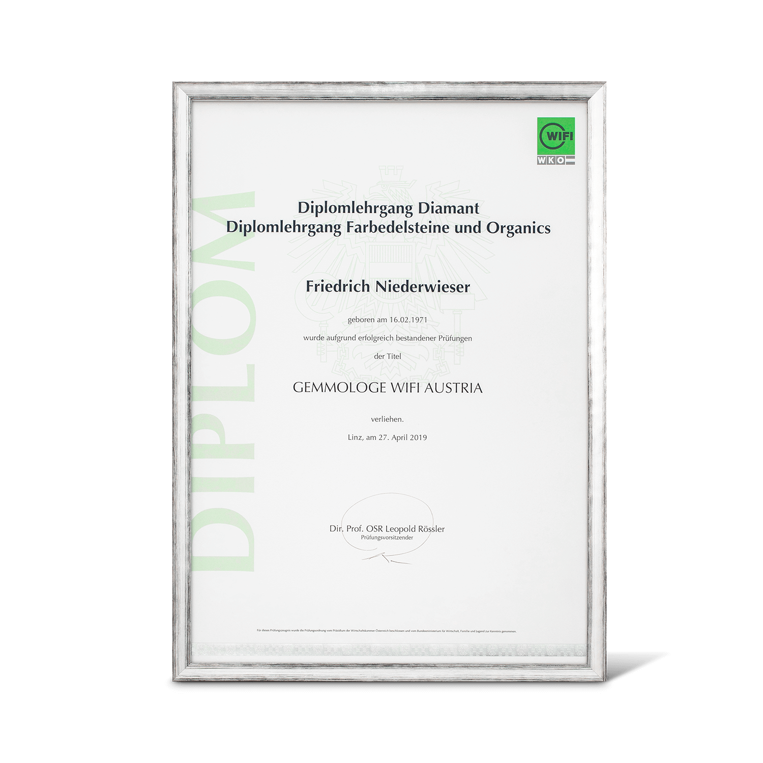 Um meinen Kunden absolute Sicherheit zu bieten, habe ich die harte Schule der Gemmologie (Edelsteinkunde) absolviert. Nach meiner Ausbildung an der Gemmologischen Akademie Linz und dem Abschluss als Gemmologe beim WIFI-Austria (2019) arbeite ich heute als Sachverständiger.